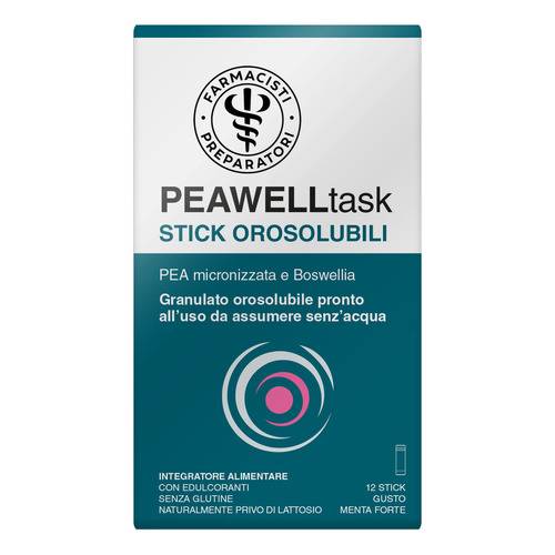 PEAWELL taskDescrizione Integratore alimentare a base di estratto secco di Boswellia e palmitoietanolamide. Con vitamina B6. Con edulcoranti. La Boswellia contribuisce a contrastare gli stati di tensione localizzati. Ingredienti Edulcorante: sorbitolo; Boswellia (Boswellia serrata Roxb. Ex. Colebr.) gomma resina e.s. tit. al 40% in acidi boswellici, palmitoietanolamide, aromi; agente antiagglomerante: biossido di silicio; edulcorante: sucralosio; vitamina B6 (piridossina cloridrato). Senza glutine. Naturalmente privo di lattosio. Caratteristiche nutrizionali Valori medi per 1 stick per 3 stick Palmitoiletanola...