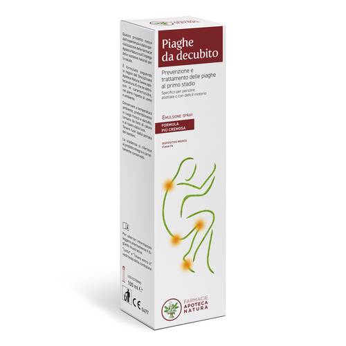Piaghe da decubitoDescrizione Emulsione spray per la prevenzione e il trattamento delle piaghe al primo stadio, prodotto specifico per persone allettate o con deficit motorio. Prodotto appositamente formulato per: -ridurre il rischio di lacerazioni, poiché forma un film lipidico superficiale dall'azione lubrificante e idrata in maniera mirata la pelle; -contrastare l'infiammazione e la degenerazione tissutale grazie alla sua azione anti-radicalica contro lo stress ossidativo per il ripristino della funzione barriera. La sua formulazione è stata studiata per essere applicata con lo spray ed è facilmente spalmabile ed assorbibil...