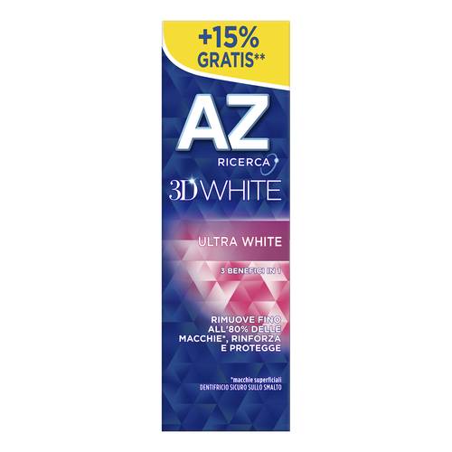 AZ 3D WHITE ULTRA WHITE Descrizione Il dentifricio AZ 3D White Ultra White è clinicamente testato, rimuove fino all’87% delle macchie superficiali e inizia a sbiancare già dopo il primo utilizzo. Formato Tubetto da 65 ml. Cod. 81761592