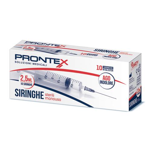 PRONTEX SIRINGHE 2,5 e 5 ml Descrizione La siringa Prontex è progettata, ingegnerizzata e prodotta secondo parametri di alta qualità, sicurezza e facilità d'uso. I materiali, la conformazione delle posizioni di fine corsa e la calibrazione tra cilindro, pistone e gommino determinano la perfetta tenuta e garantiscono la sicurezza del paziente e dell'operatore. Grazie alla triplice affilatura dell'ago si ottiene un'alta capacità di penetrazione e una ridotta traumaticità per la cute e il sottocute. Dalla presa ergonomica e perfetta calibrazione tra pistone, cilindro e gommino di tenuta. Il cilindro è realizzato in polipropilene ...